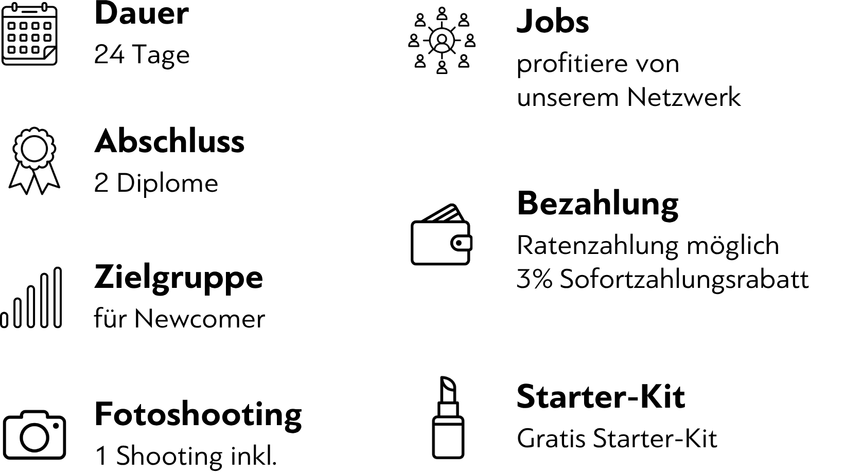 Sie werden gezielt im Bereich Selbständigkeit, Beauty, Glam, Bridal, Backstage, Editorial und Fashion Make Up ausgebildet und erhalten 2 Diplome. Nach Abschluss dieser Ausbildung sind Sie ein absoluter Profi und beherrschen die Fähigkeit, zeitnah und trendorientiert zu arbeiten und schnell erfolgreich als Make Up Artist Fuss zu fassen.
